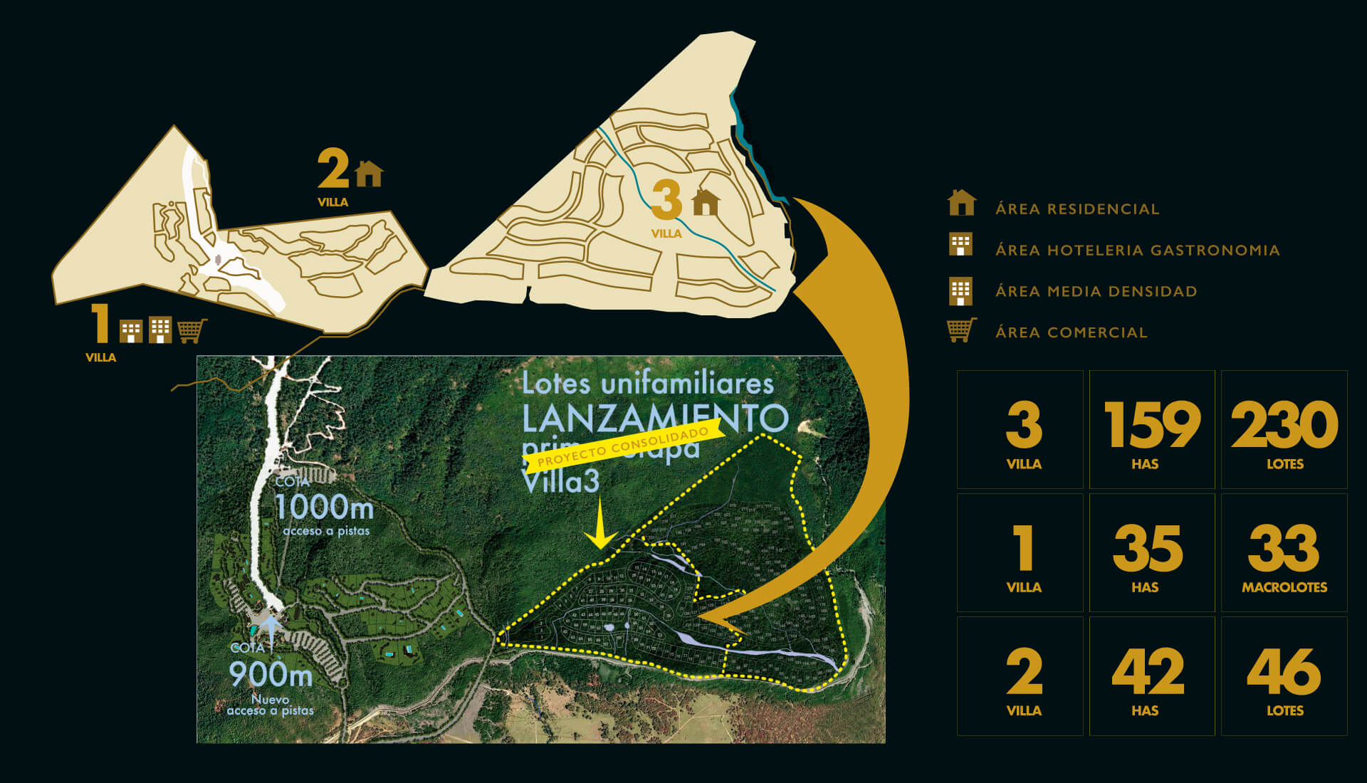 El desarrollo cuenta con tres sectores claramente definidos, 2 residenciales y una villa turística comercial y de usos mixtos. Nuestro proyecto tiene como primer objetivo armonizar en un todo con el entorno natural del Cerro Perito Moreno. El proyecto de desarrollo urbanístico fue desarrollado por BMA (Estudio -Modas, Miani, Anger), el arquitecto Daniel Alonso, la colaboración de Ingenieros de la localidad y del Agrimensor Enzo Rossini.